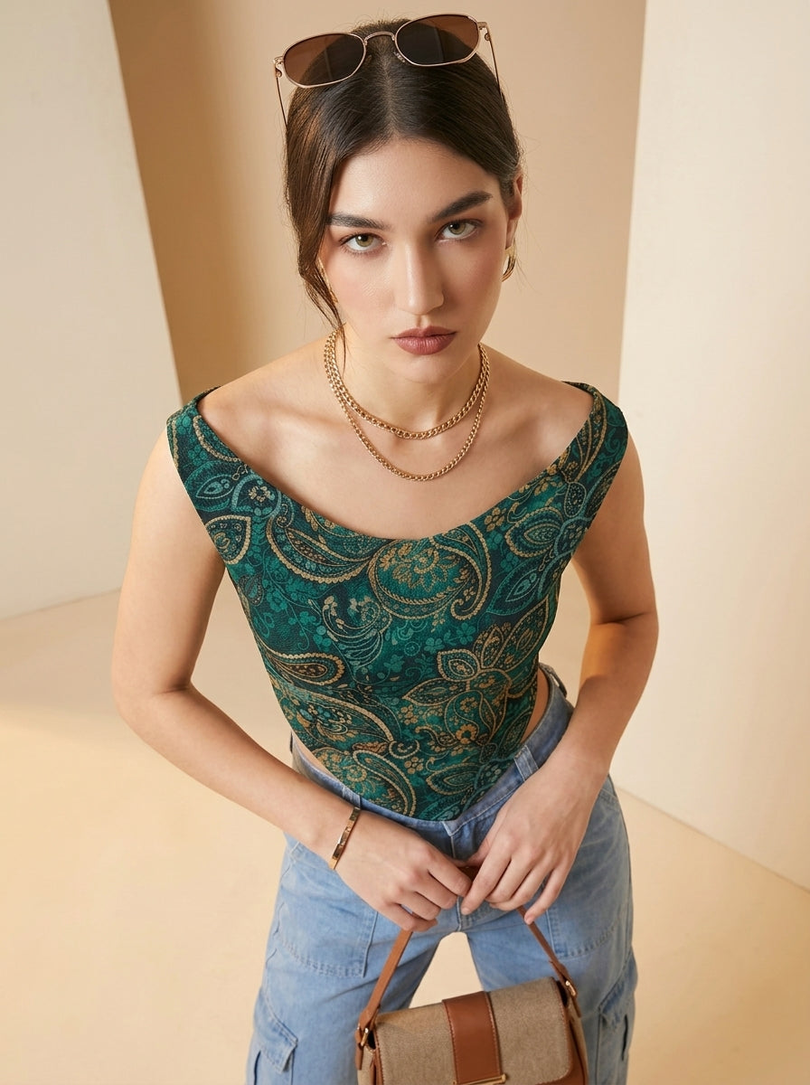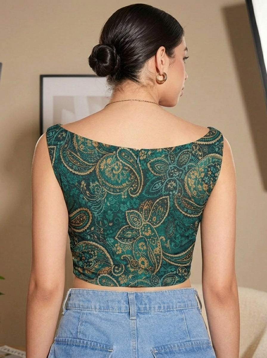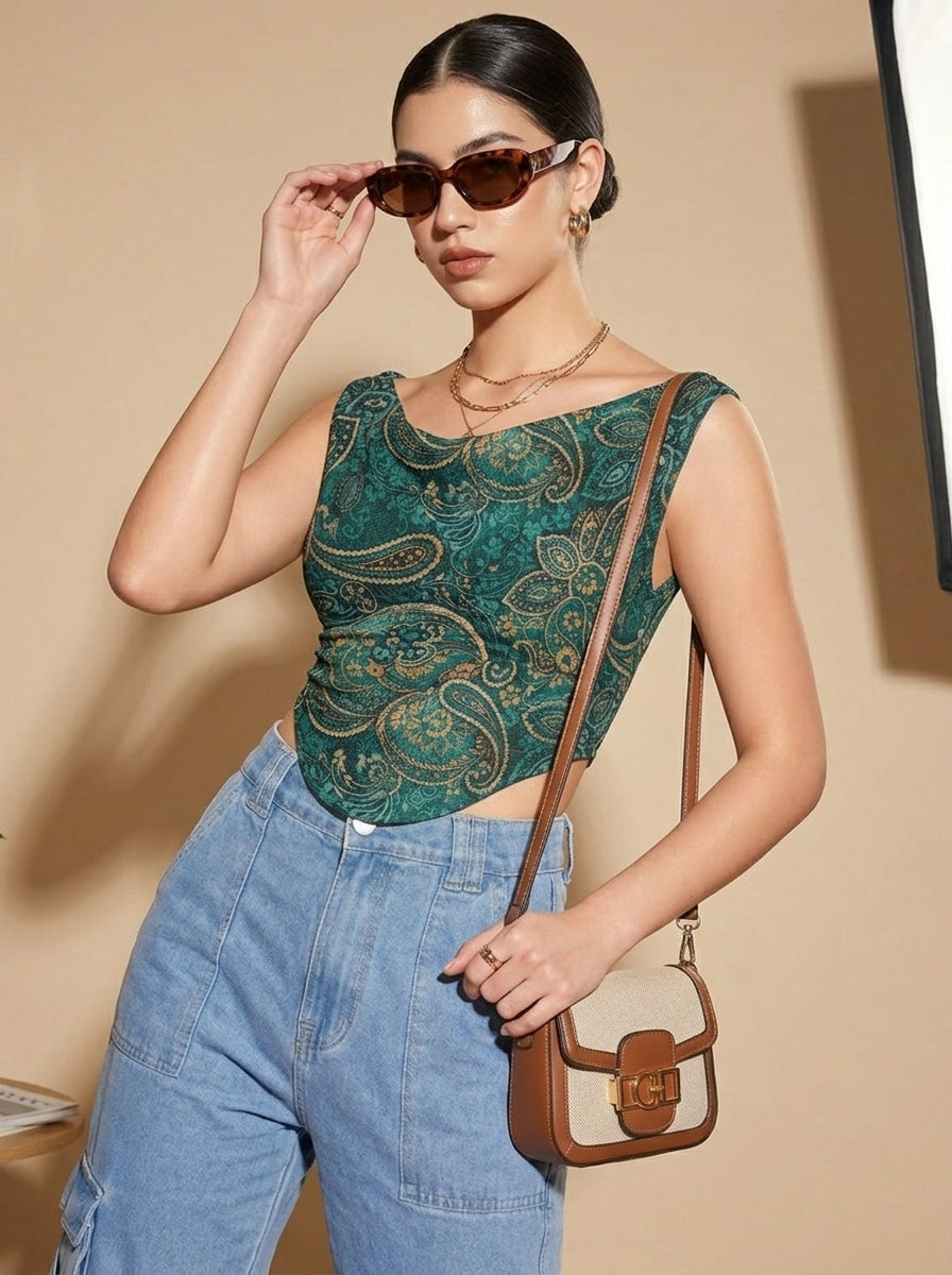 Istyle Can Women Green Mesh Lined Ruched Asymmetric Sleeveless Crop Top